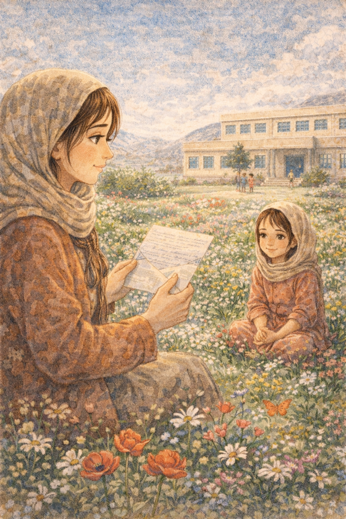 Una mañana, Amal vio a varios niños arrodillados alrededor de una amapola.