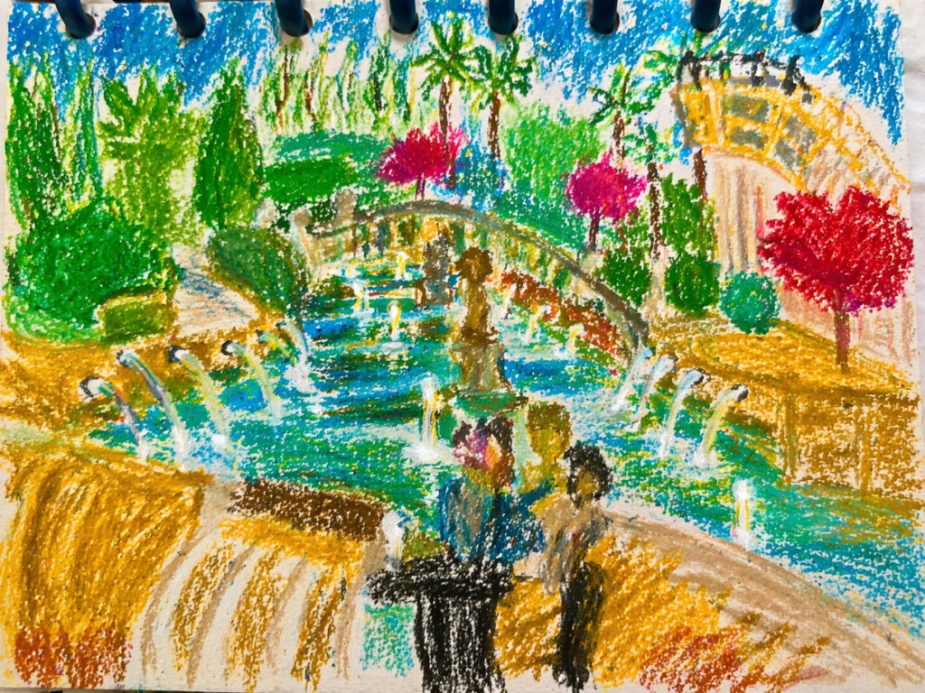 No intentaba copiar la fuente. Pintaba lo que sentía: el murmullo del agua, la memoria de la piedra, la luz que parecía respirar.
