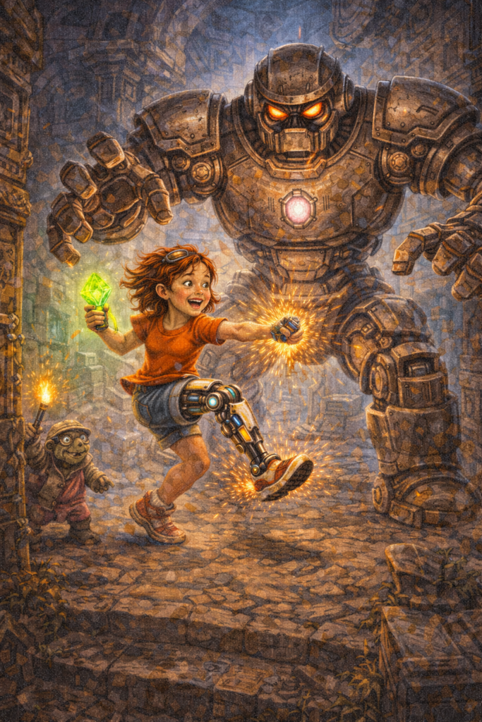 El robot corría como un misil. Elara activó modo turbo. Su pierna hizo: