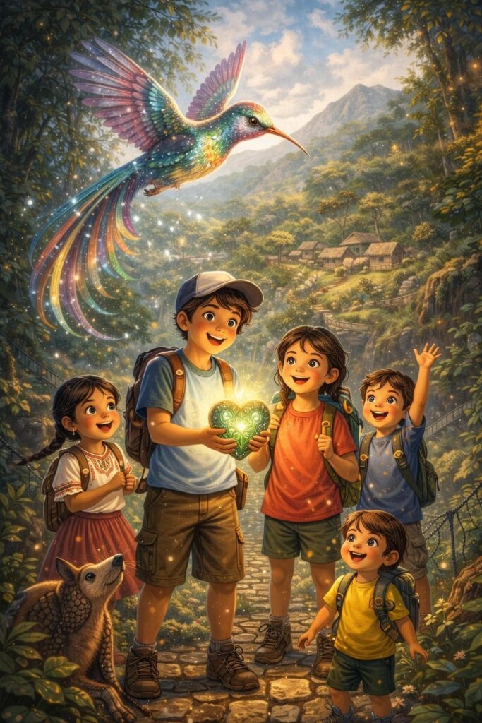 El colibrí les explicó que la comunidad estaba en peligro: la Piedra del Corazón, que cuidaba el agua y la tierra, había perdido su brillo. Solo niños con corazón valiente podían devolverle la fuerza.